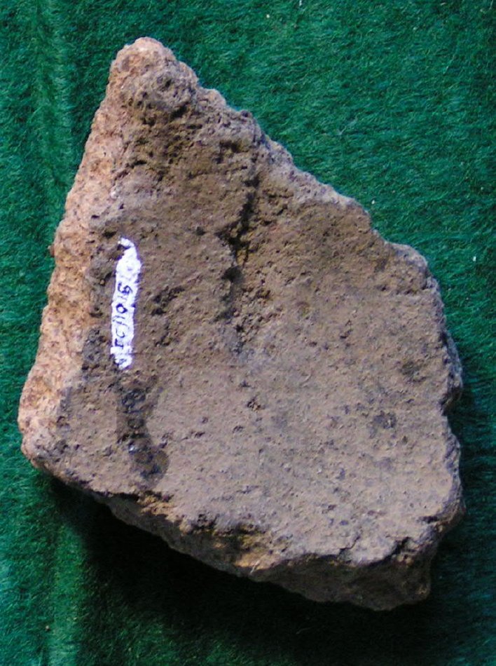 Reddish clay, ceramic sherd, very course clay, huge grain, no decoration, slightly concave inner surface. ICRC artifact collection. No provenience.