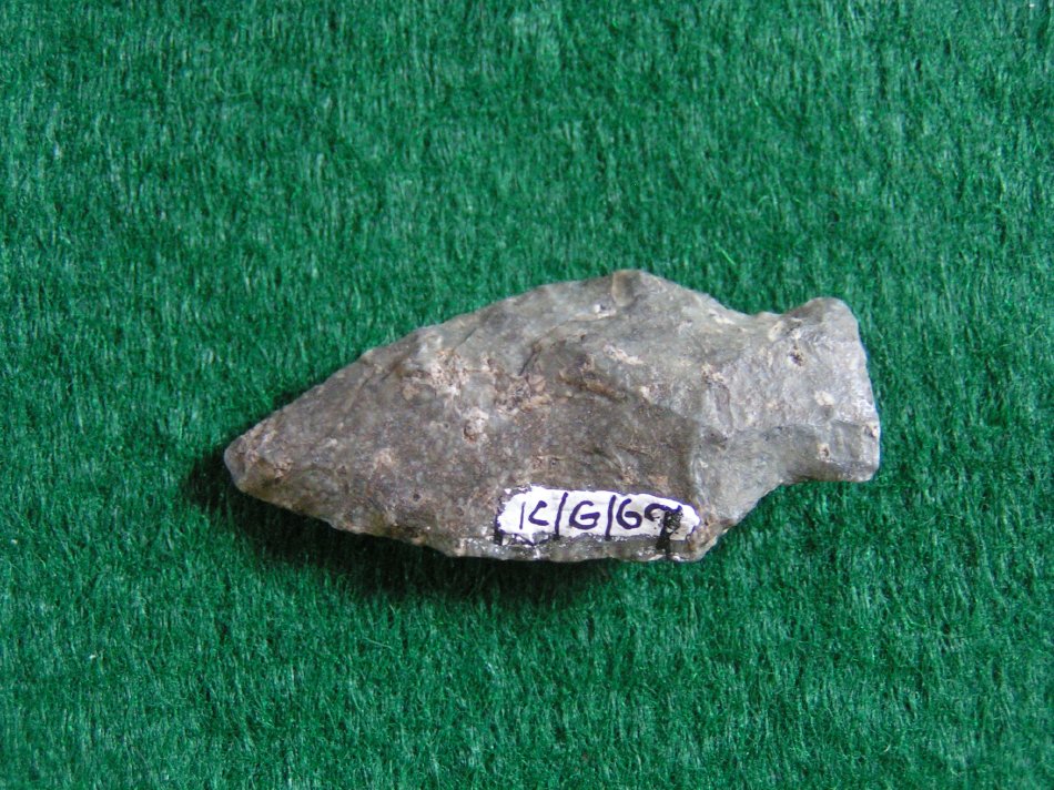 Blade generally ovoid in outline with slightly excurvating edges. Insloping shoulders and straight stem and flat base. Bi–convex in cross–section.
