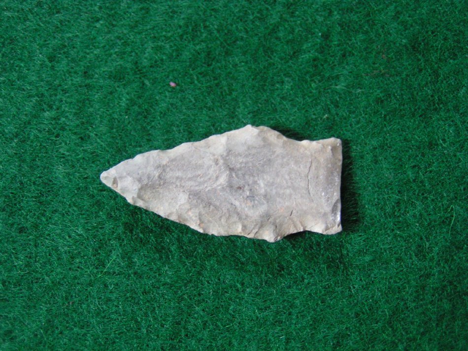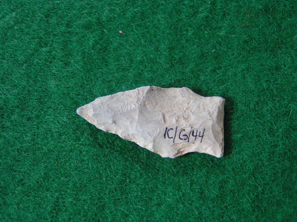 Blade generally ovoid in outline with one excurvating edge and incurvating edge on the sides. Chipped stem with flat broad base. Fairly flat in cross–section.