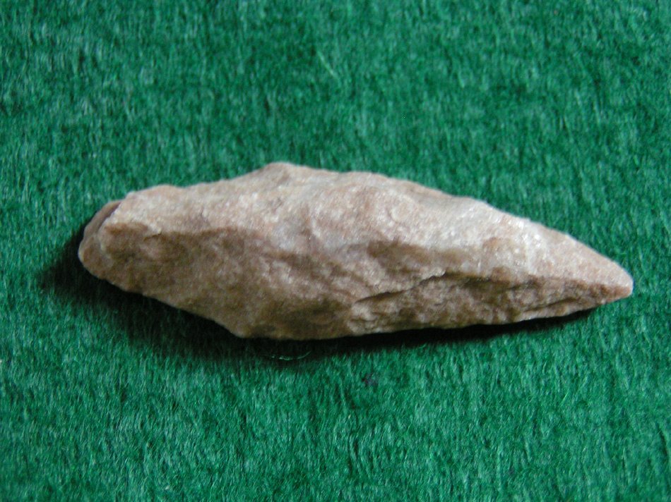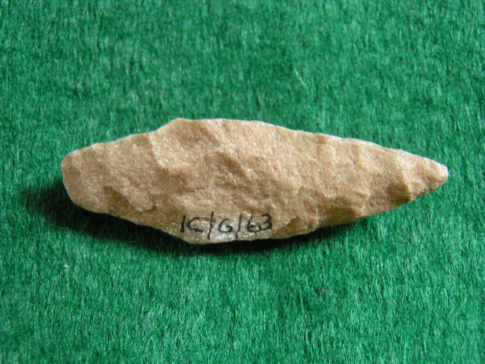 Lozenge shaped with straight edges and stem with a slightly rounded base. Flat on one side, convex on the other in cross–section.