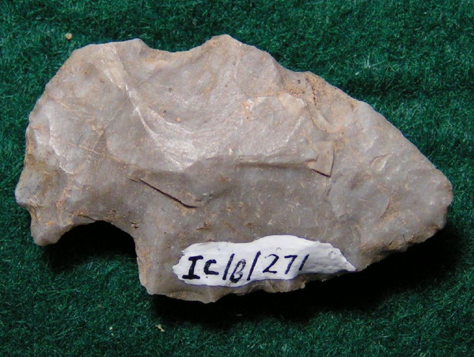 Side notched edges excurvate, one ear broken, base convex. Cresap Lawn, MD Wills Creek, Jan Thompson