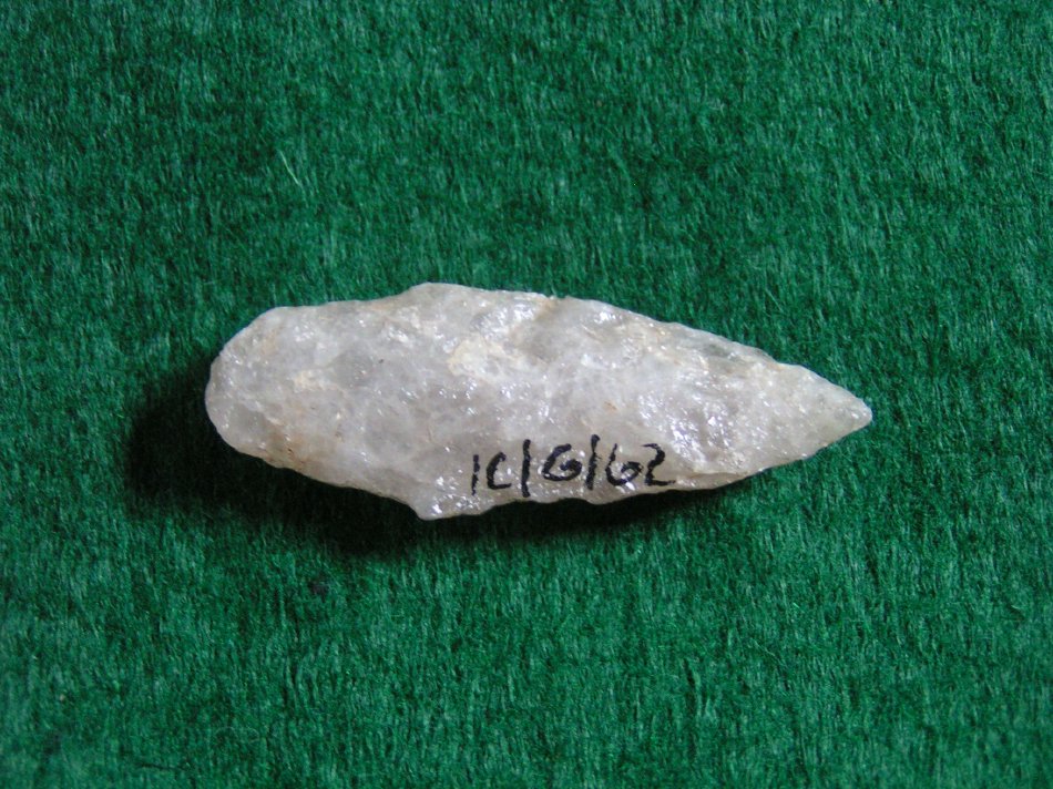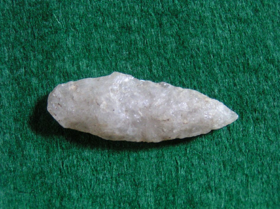 Lozenge shaped with slightly excurvate edge and sharp point. Rounded stem with convex base, and bi–convex in cross–section.